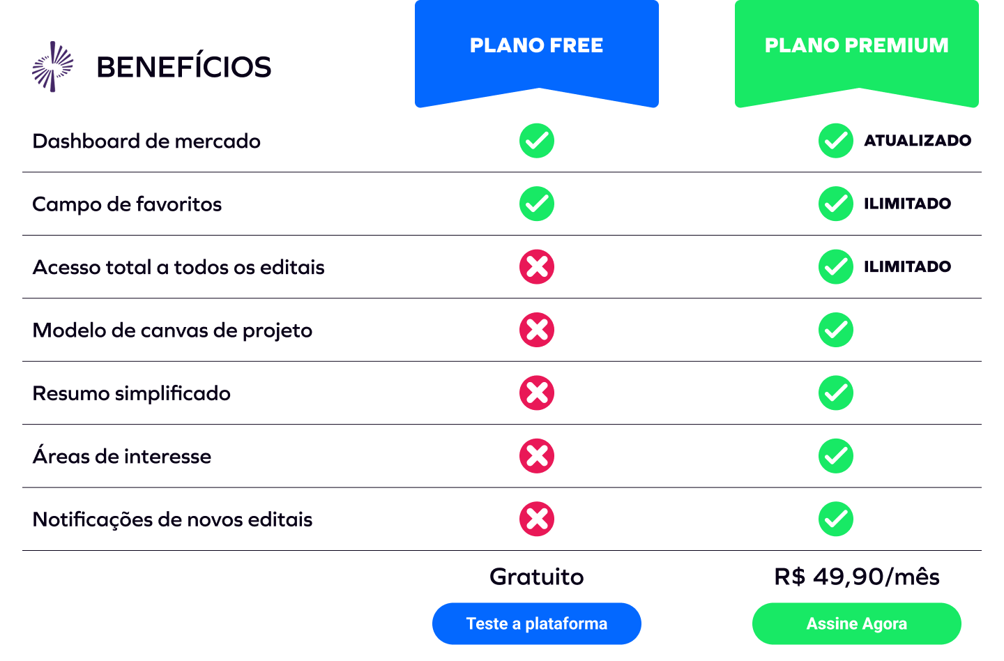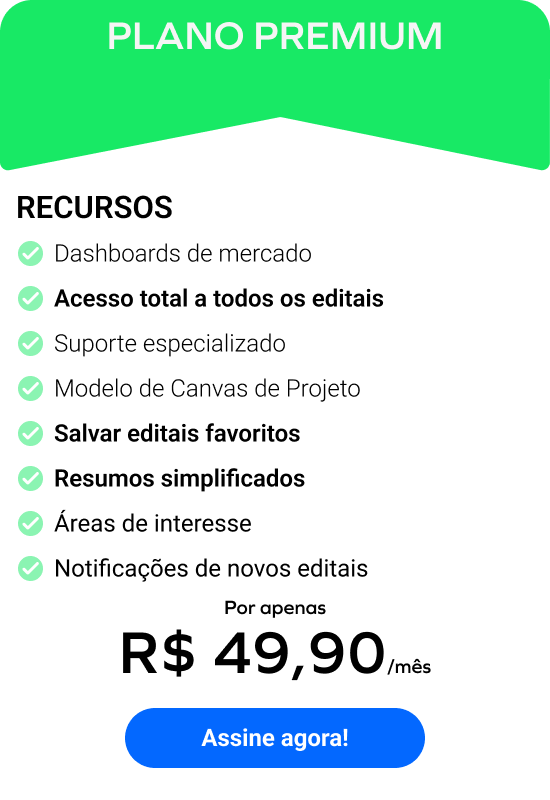 - Maior assertividade na escolha de editais alinhados ao seu projeto.